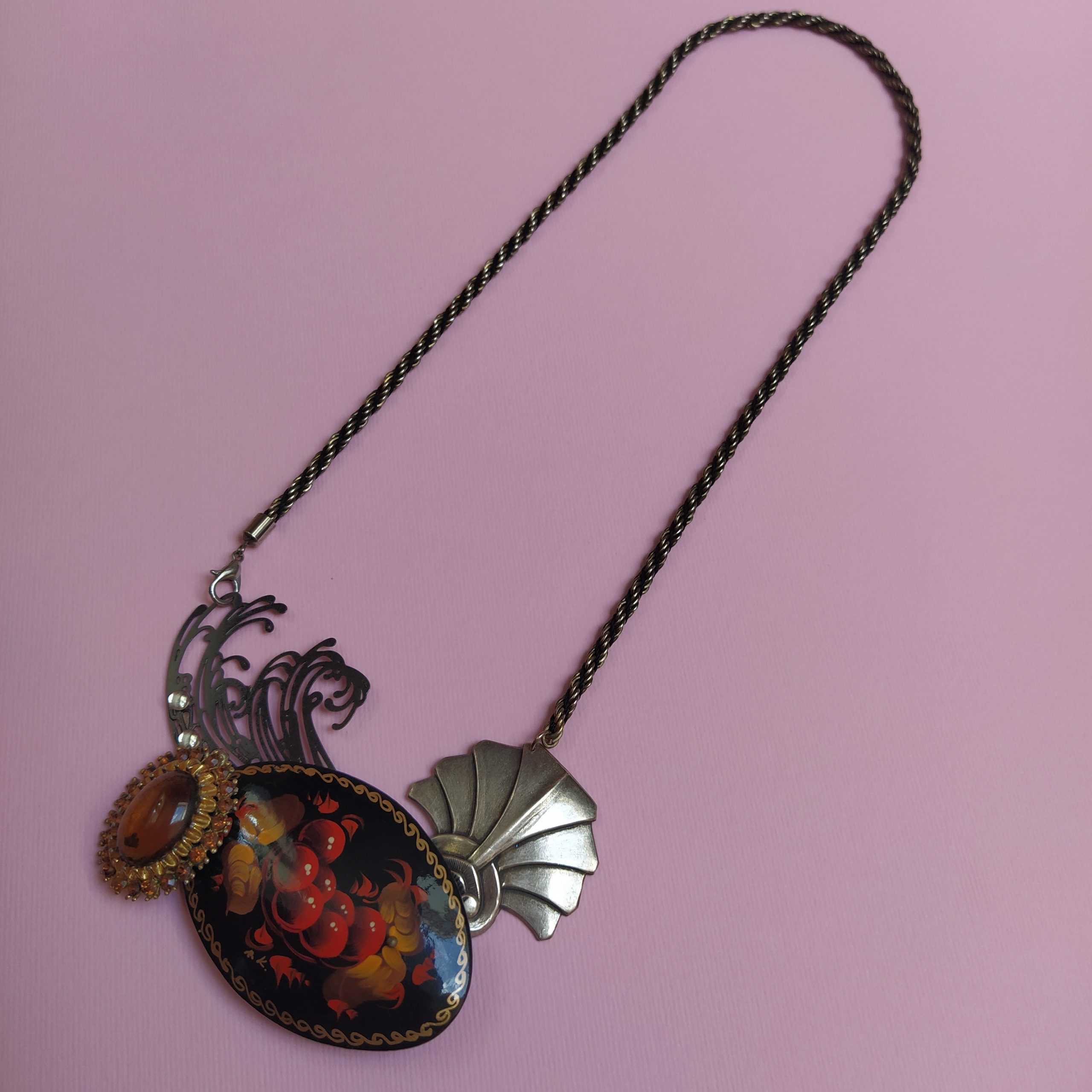 Collier composé d’une chaîne vintage, d’une ancienne boucle d’oreille, d’une broche vintage russe, d’une autre broche ancienne strassée et d’un élément de collier filigrané contemporain.